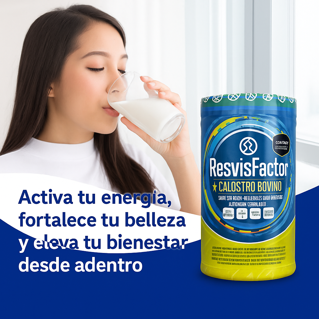 ResvisFactor Calostro Bovino es un suplemento nutricional de nueva generación diseñado para fortalecer tu organismo desde la raíz. Su fórmula combina el poder del calostro bovino —fuente natural de inmunoglobulinas, factores de crecimiento y proteínas bioactivas— con colágeno hidrolizado, hongo shiitake, betaglucanos de ganoderma, quinoa, malta y vitaminas esenciales (A, C, E, B1, B2, biotina y niacina).
